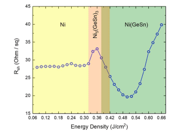 Sheet resistance evolution with the Energy Densisty for Ni / Ge0.9Sn0.1 samples annealed by UV-NLA with a single laser pulse.